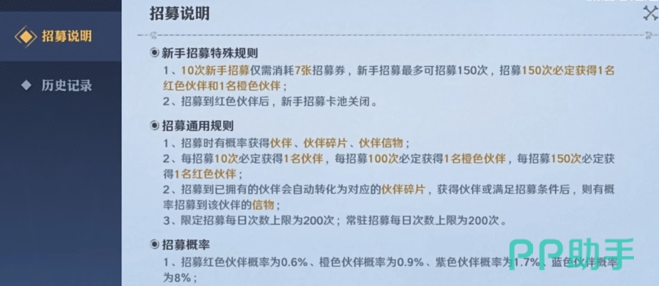 除了新手招募外,游戏还设有通用招募规则,这就是大家平时说的常驻卡池啦,无论是限定招募还是常驻招募,每日次数上限均为200次,这样的设计保证了玩家有足够的招募机会,同时这里的招募概率也是经过精心设计的,红色伙伴作为顶级战力,其招募概率相对较低,仅为0.6%,而橙色伙伴、紫色伙伴和蓝色伙伴的招募概率则相对较高,分别为0.9%、1.7%和8%。