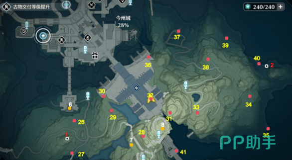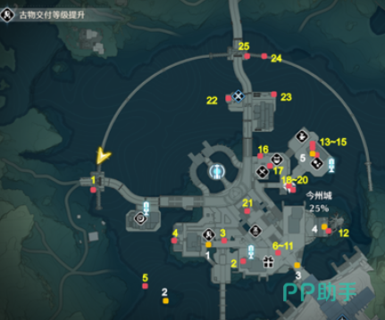 今州城宝箱在游戏中属于数量非常多的一个板块地图宝箱了,在该地图中总共有41个宝箱玩家们寻找一下看一下自己有没有遗漏的宝箱。在鸣潮今州城的内外都是拥有宝箱的,而且他们的聚集点很明显,1~25个宝箱的位置主要是在 鸣潮今州城的中心如下图所示,玩家可以根据标记来进行寻找。