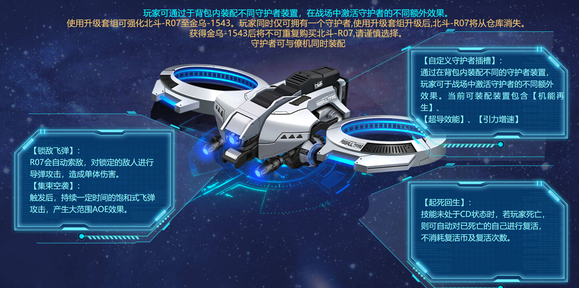 接下来我们详细说一下北斗无人机的攻击和复活技能,北斗无人机大多是蓝白色系的,隐藏在天空中,不易被发现,具备了普通射击的能力,可以对敌人进行攻击,触发空袭后,会造成大范围伤害。升级版的北斗星拥有复活技能,可以复活已经战死的玩家,大大提升了玩家的生存能力,进一步提升游戏的体验感。