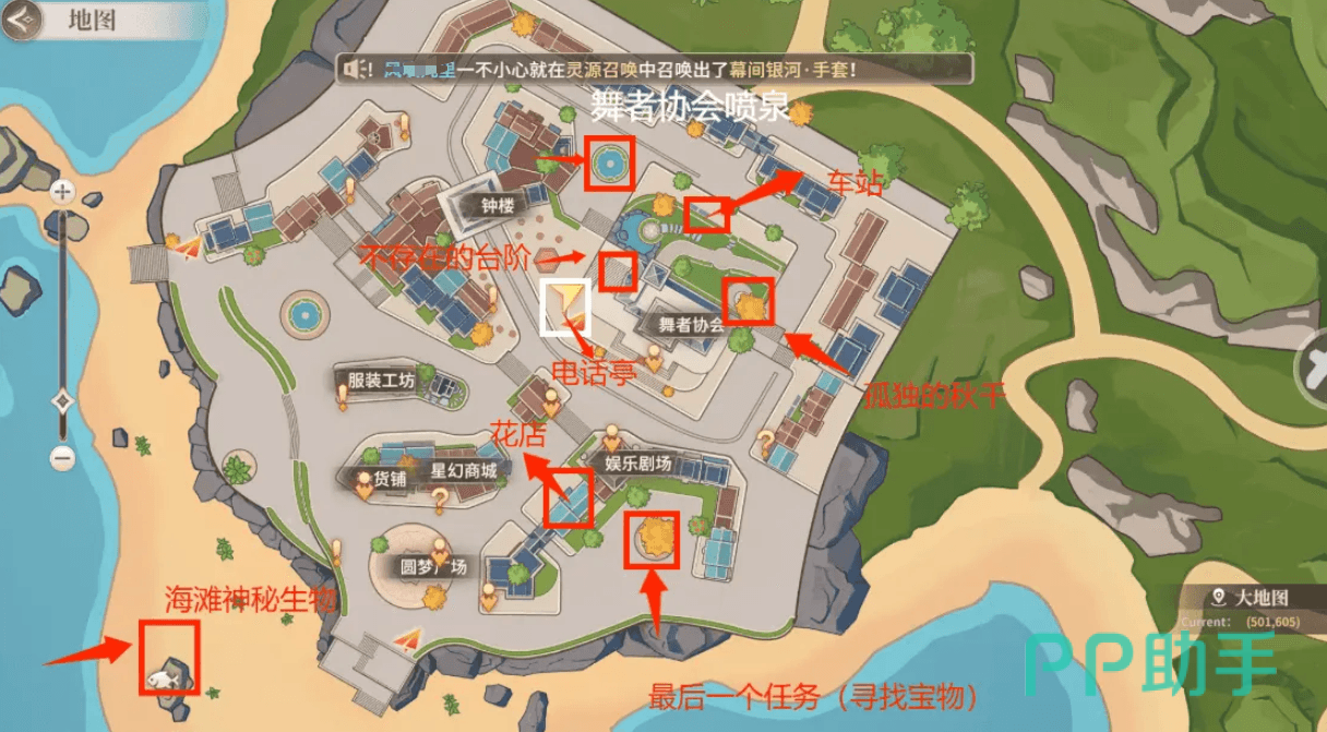 首先第一个是未接之谜是海滩神秘生物,找这个玩家需要先来到星乐小镇的圆梦广场,直走进入海滩范围后,向右就可以找到,这些任务靠近会有亮光,所以很轻易就能发现,第二个是不存在的台阶这个位置在舞者协会于钟楼的交界处。