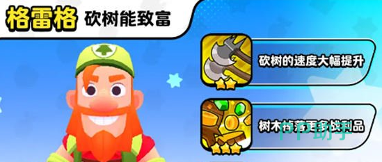 第二个要介绍的强势角色是格雷格,他虽然没有战斗能力,但却是现在非常流行的伐木流最强角色,能帮助玩家快速收集资源,他在一星的时候能在地图上砍树,获得宝石和金币等资源,2星的时候能让砍树的速度大幅度提升,3星的时候更是能让砍树获取的资源成倍增长。
