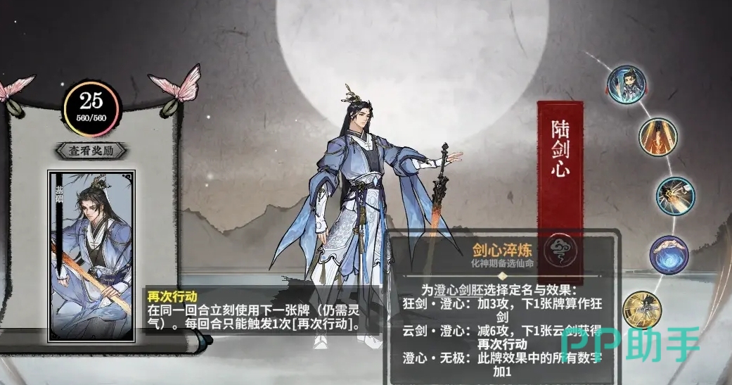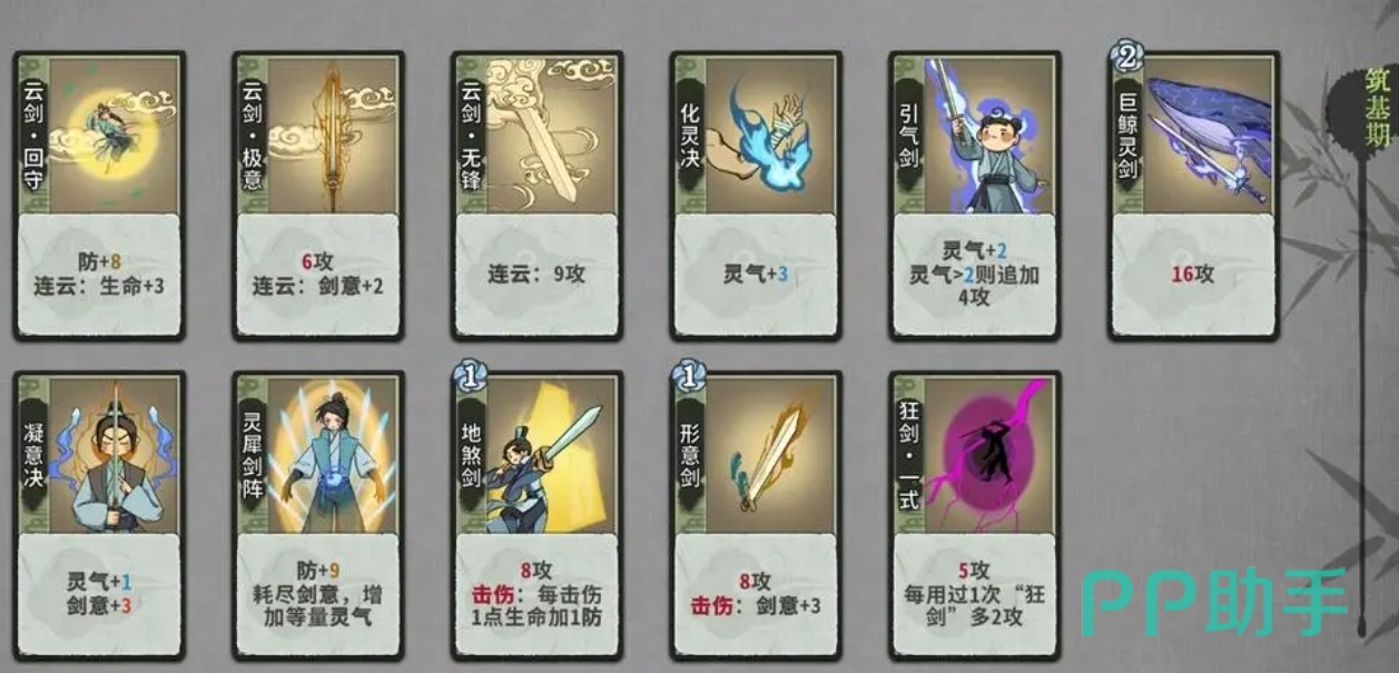 1、主要玩法上以叠剑意为主,也就是通过他的剑胚和各种增加剑意和攻击的卡牌来提高斩杀线。