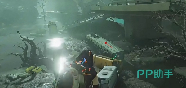 进游戏后镜头右转,先消灭右侧桥上大巴顶部的触手,然后直接滑翔,朝着桥下侧翻的白色火车上飞,落在最中间位置,注意是最中间的位置。