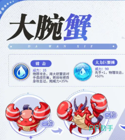 水系精灵大腕蟹以巨大的蟹钳闻名于世,这只螃蟹不仅力大无穷还非常聪明。它能利用蟹钳锁住敌人造成持续伤害,如果敌人之前已经受过它的攻击,那么这次的伤害还会额外增加。而它的绝招更是物理攻击的巅峰之作,能够瞬间提升威力重创敌人。