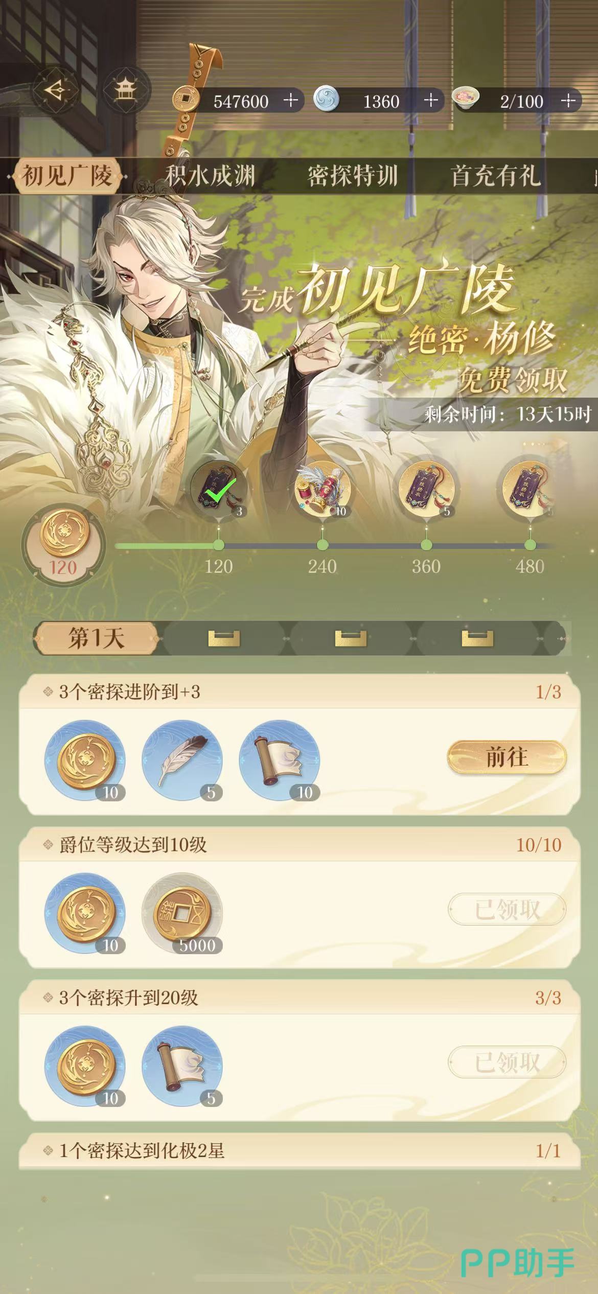 新手小伙伴将新手教程都完成之后,并且将一系列的任务活动都要做完,全都完成的情况下就可以获赠金色密探“杨修”了。这一个过程的第一步,就是将主线剧情的第一章完成,之后就自动开启第一天的任务栏了。