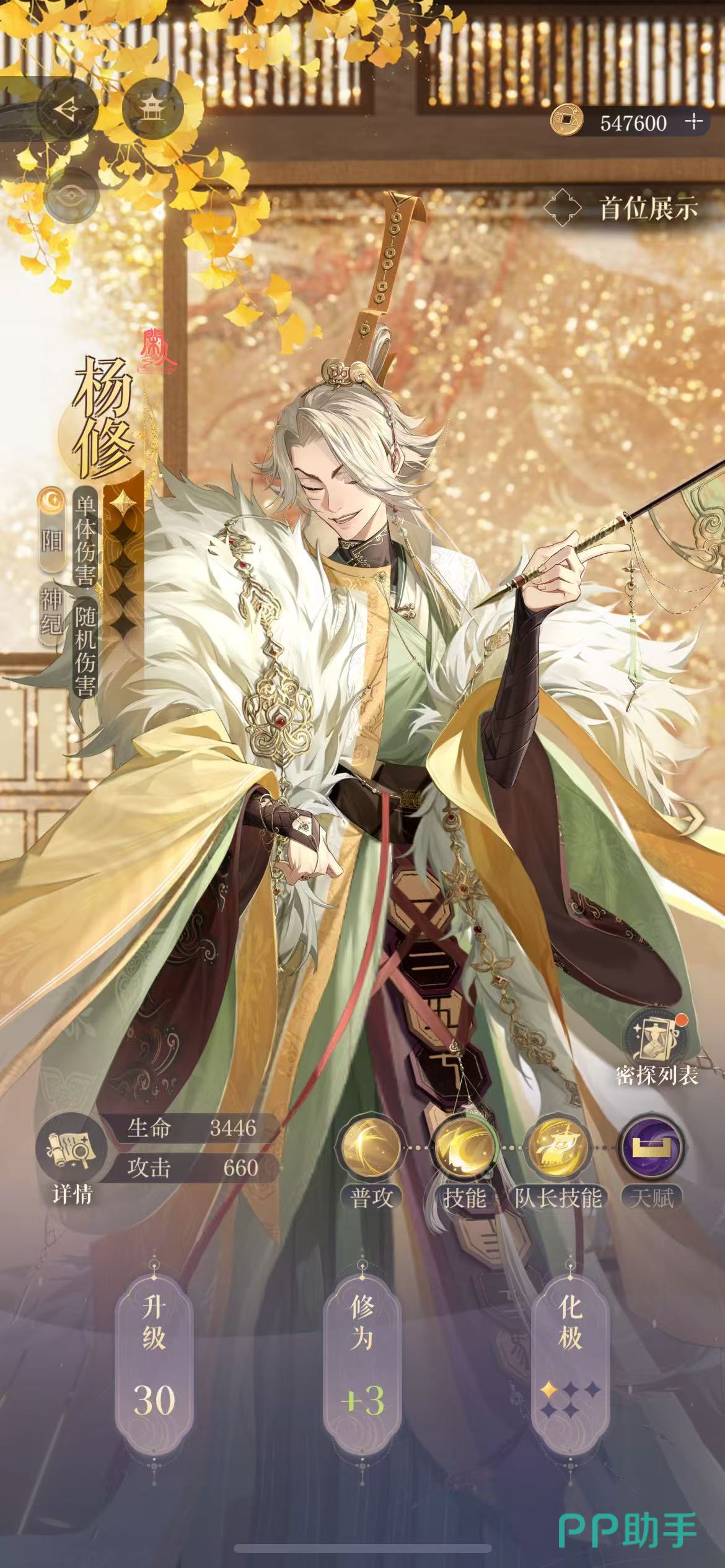 杨修作为一个绝密品质的密探,品质是最高的那一种,同时他也是新手队伍当中强力的角色,对于大家通过前期关卡的帮助作用还是非常大的,是非常值得去获取的密探。