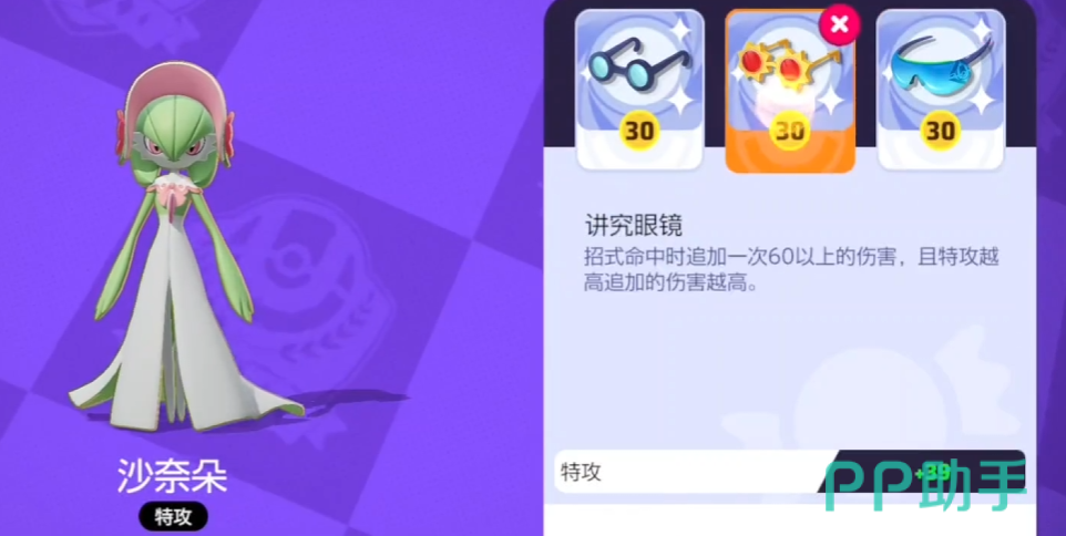 沙奈朵在游戏中的定位是远程攻击,它的输出是非常强的,但同时它也有一个缺点,那就是防御力比较弱,因此小伙伴们在战斗的时候需要尽可能地躲在队友的身后保证自己能够安全存活,因此在选择道具的时候,小伙伴们除了需要为沙奈朵选择一些能够提高他输出的道具,同时也需要兼顾一下防御能力。因此小编为大家推荐的配置是进击眼镜、博识眼镜和贝壳铃铛。贝壳铃铛可以保证沙奈朵的生存能力,而另外两个眼镜都是为了提升输出而存在的。