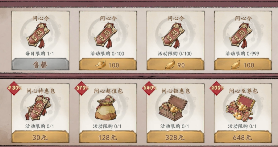 孤星残这个活动主题流程是比较长的,首先从同心商店来看,这个商店可以购买问心令,是兑换这个侠客的关键道具,不过免费的牌子一天只有一个,大概玩家们一周能领取到6到7个左右,而想要短时间获得令牌的话,那么就只能通过使用元宝购买了,那是比较费钱的,零氪玩家只推荐领取免费的牌子。