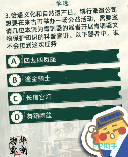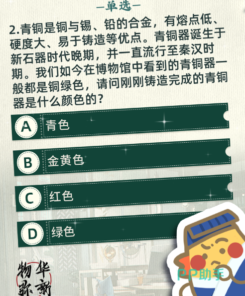 例如,在文化和自然遗产相关的问题上,可能会出现如图所示题目,正确答案是B。由于青铜器在古时被称为“金”或“吉金”,是红铜与其他化学元素锡、铅等的合金,刚刚铸造完成的青铜器是金色,但因为出土的青铜因为时间流失产生锈蚀后变为青绿色,被称为青铜。