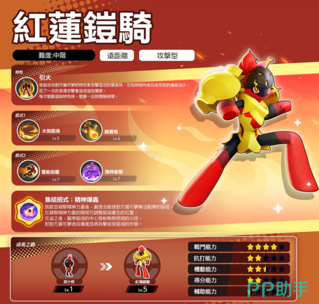红莲铠骑在游戏中定位为攻击型法师,拥有惊人的7100血量,在攻击型宝可梦中名列前茅。其技能组合包括燃尽、火焰旋涡与铠农炮等,每个技能都各具特色。燃尽技能能造成燃烧效果,降低对手恢复效果,火焰旋涡则能在造成伤害的同时提升双防,并叠加效果,铠农炮则是一发能量炮,能禁锢敌人并造成高额伤害。