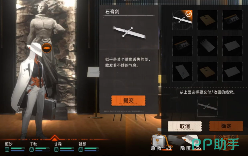 探索到三楼后,进入5号展厅,与英格丽特交谈,接着走通风管道,通往休息室。在这里,你需要将石膏剑插回原位,解锁线索9。