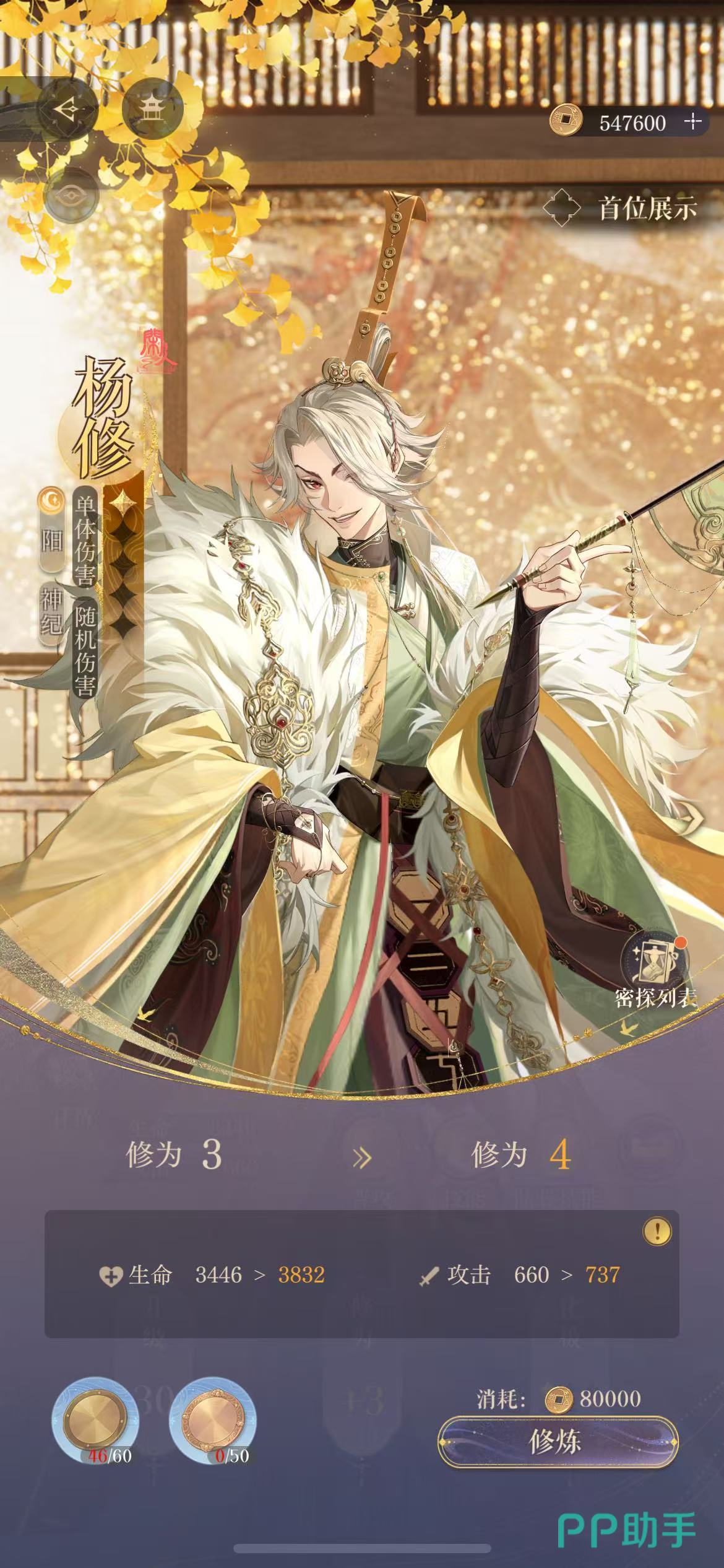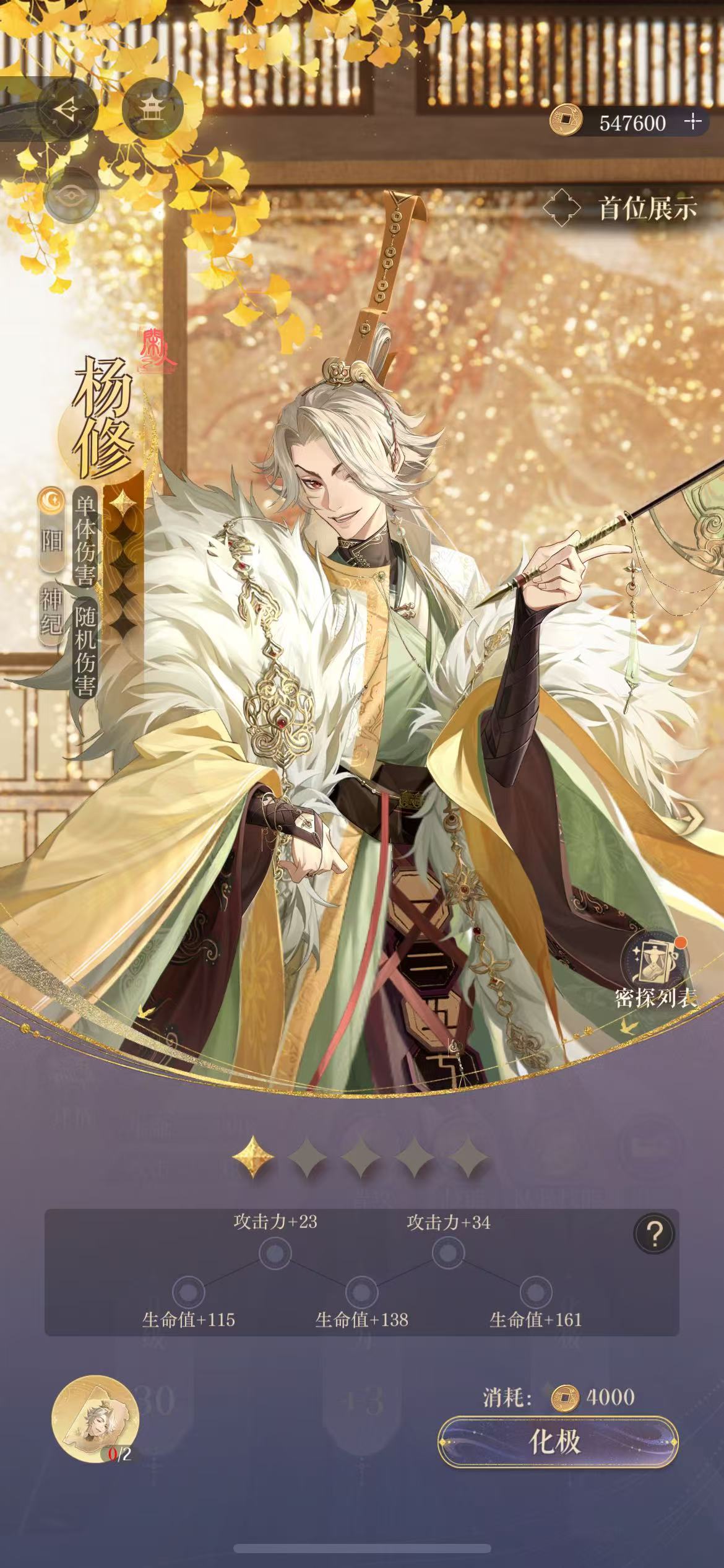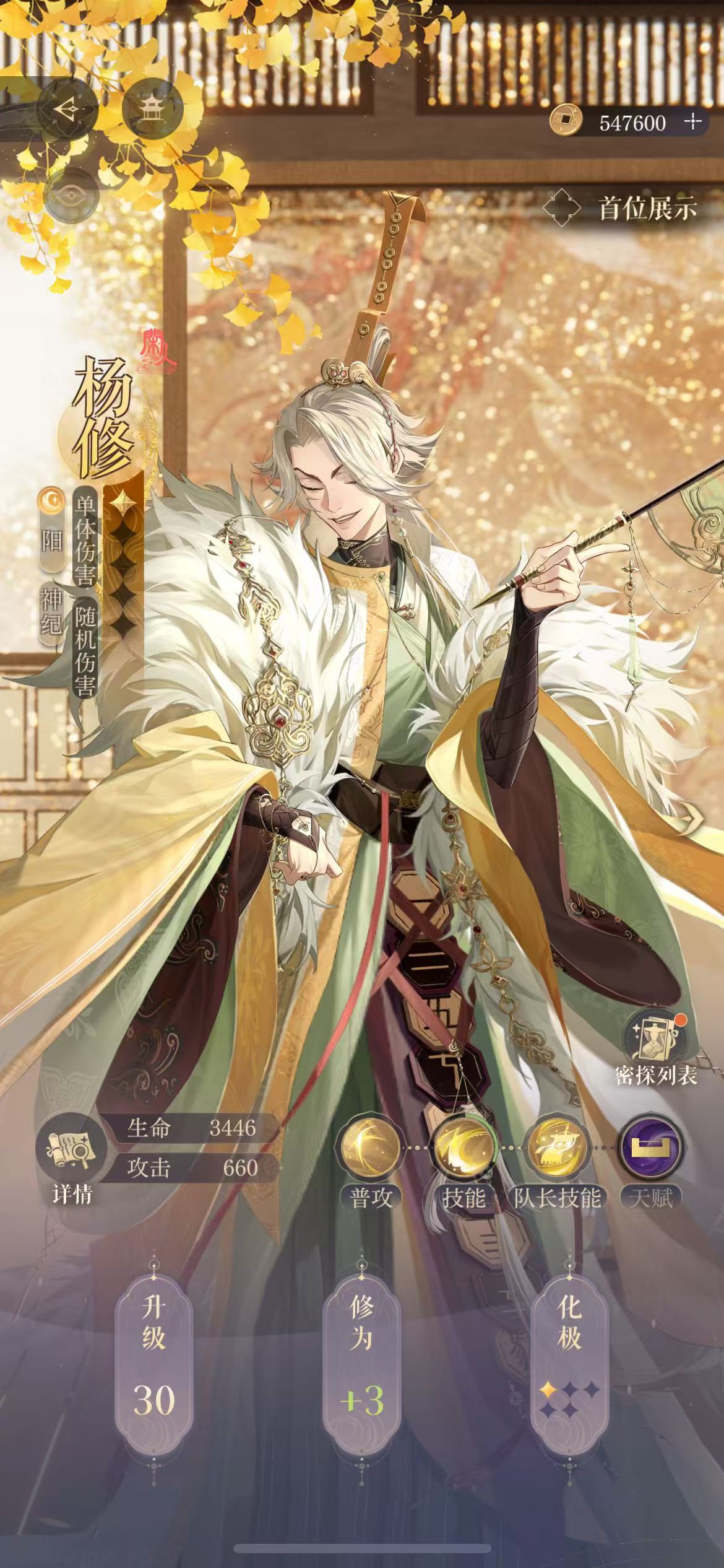 杨修是阳属性的神纪密探,他的品质很高,更专注于对敌人造成单体攻击,同时随机伤害的效果也比较强。“六博”的普攻没有什么额外的能力,主要就是可对敌人造成100%的攻击伤害。