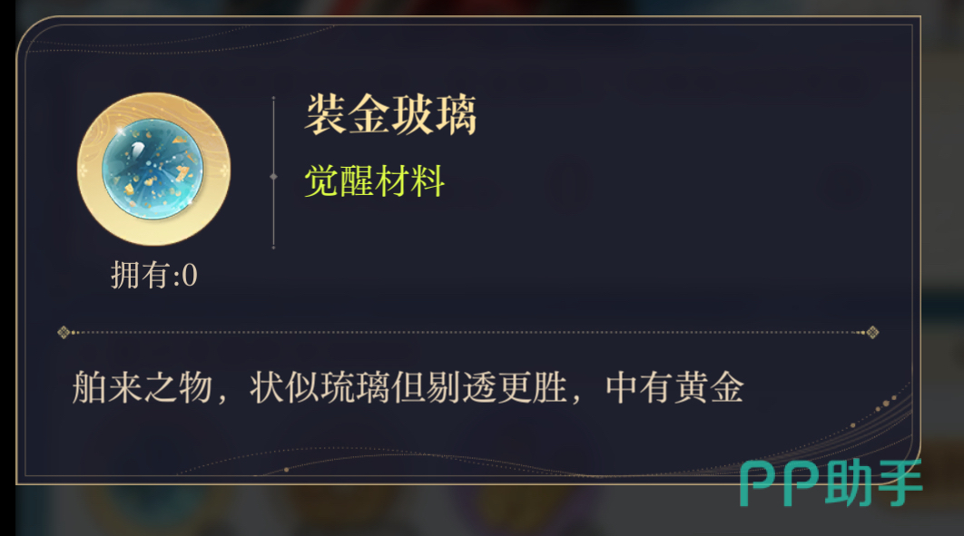 装金玻璃是金色稀有度的道具,用于密探化极五星后觉醒,金卡与紫卡密探都需要一颗装金玻璃。主要获取的途径有:兰台商店、大型限时活动、遗迹满星奖励。
