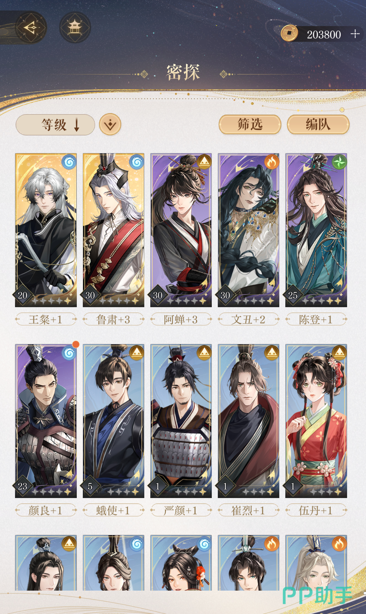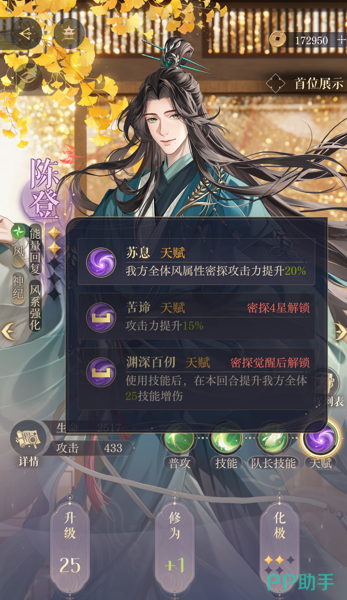 需要注意的是密探天赋需要化极觉醒解锁,比如陈登二星解锁苏息天赋,给全体风属性密探提升20%攻击力。五星觉醒之后可以解锁完整的密探天赋,对战斗的增益非常大。
