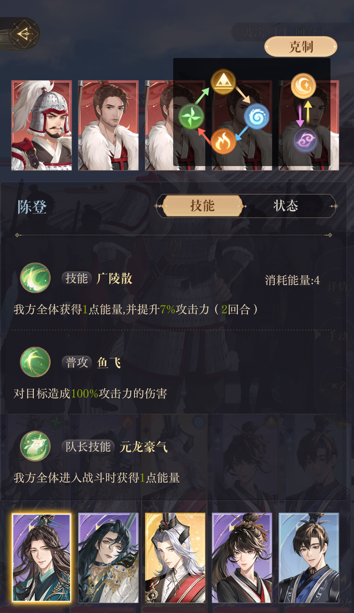 战斗每经过一个回合,场上的密探可以获取一点能量值,满能量点能够发动密探的技能攻击,发动方式是上划该密探卡牌。比如阿婵左上方能量一共三点,意味着满三点能量就能开大招。部分的打火机类型密探具有使己方队友恢复能量,拉快战斗节奏的功能,比如陈登当队长为可以让全队开局额外获取一点能量,广陵散给阿蝉在再回合中额外获取一点能量,可以实现开局放大招。