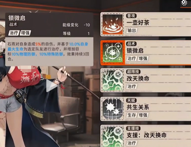 她的战术——锁微启,这一技能让石燕在治疗的同时增加目标的防御能力。虽然需要承受5%的自伤,但能够基于15.04%自身最大生命值的治疗效果,以及10%的物理和特殊防御提升,让她成为队友间不可或缺的保护者。持续三回合的效果确保了团队的稳定性。