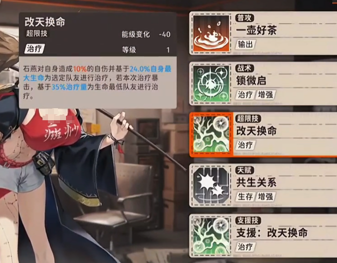 “改天换命“作为支援技能,石燕依然不负众望。通过19.99%自身最大生命的基础治疗,她能够在关键时刻为队友提供生存保障,确保团队整体的延续性。