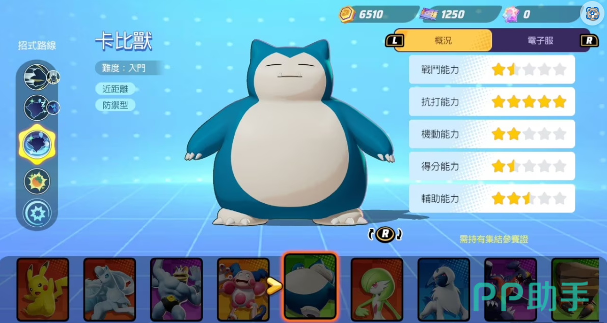卡比兽作为坦克角色,拥有强大的生存能力和控制能力。其被动技能“贪吃鬼”在朝向树果时增加移动速度,并可通过吃树果获得加成。一技能“睡觉”能回复自身血量,二技能“肚皮冲击”则能击退敌人并强化下一次普攻。挡路和哈欠技能分别提供阻挡和睡眠控制效果,大招进入睡眠状态对范围内敌人造成持续伤害和击飞。