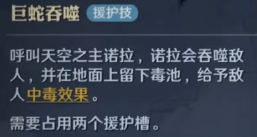 大蛇诺拉的援护技能叫做巨蛇吞噬,使用之后将会在战场中直接召唤出大蛇,它可以将敌人吞噬,造成高额的伤害,并且还会在吞噬之处的地面上留下它的毒液,让敌人受到持续的中毒效果,它还有一个响亮的名字叫做天空之主。