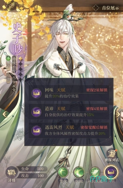 游戏中的史子眇天赋之一是回味,这个天赋在密探达到2星时解锁。它可以提升20%的治疗效果,使得史子眇的治疗技能更加有效,无论是回家吃饭还是其他治疗技能,回味天赋都能够增加它们的治疗效果,当史子眇的密探等级达到4星时,他会解锁道谛天赋,这个天赋可以自身提供的治疗效果提升15%。当史子眇进行觉醒后,他将解锁迅雷风烈天赋,这个天赋可以使我方全体风属性密探攻击力提升20%。