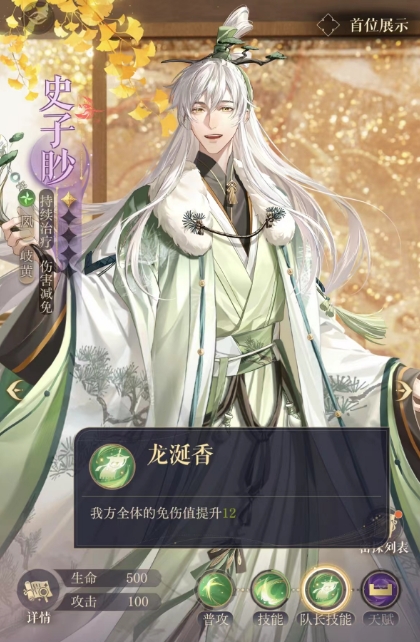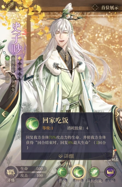 除了回家吃饭技能外,史子眇还有一个队长技能叫做龙涎香,这个技能可以将我方全体的免伤值提升12,作为队长的史子眇来担任是一个不错的选择,至少团队的生存会更有保障一些,龙涎香技能的存在使得史子眇不仅能够通过回家吃饭技能为我方队伍提供持续的生命恢复支持,还能够通过提升免伤值来增加整个队伍的生存能力,除了这些技能之外,天赋效果也是大家不能忽视的。