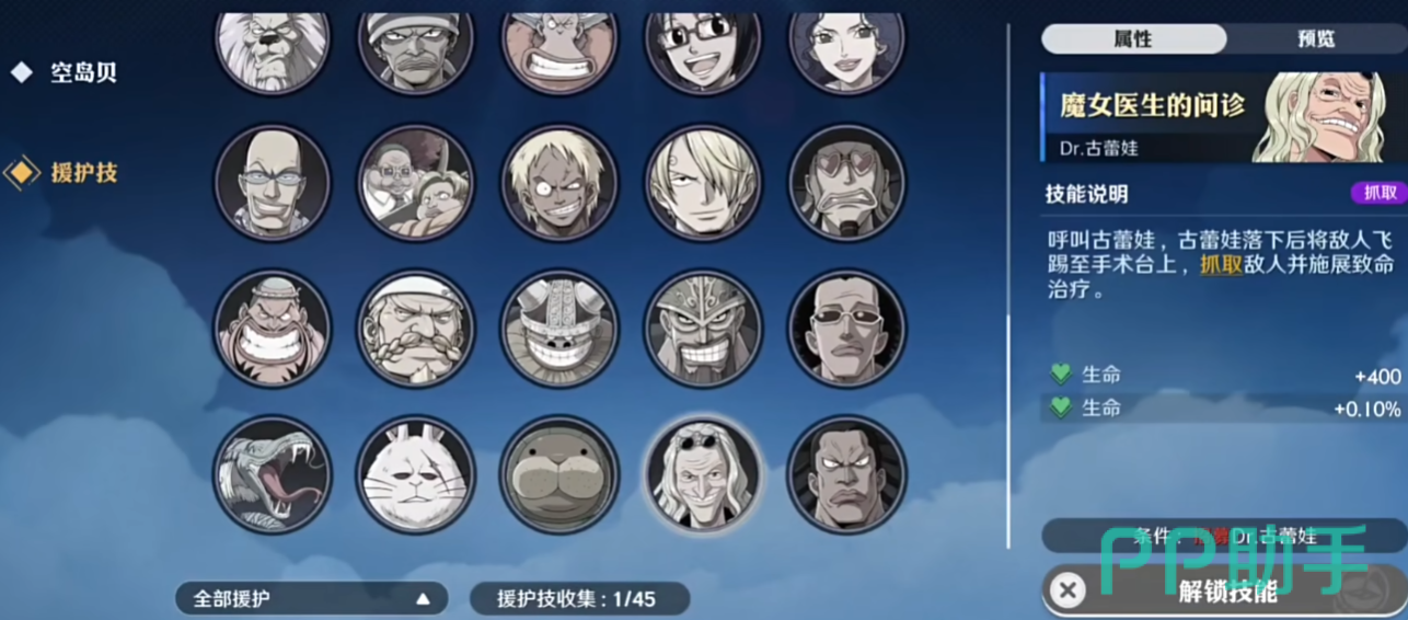 航海王壮志雄心游戏中一共有四十五位角色,其中主要伙伴是三十三位,援护类技能伙伴是十二位,援护类的角色是只拥有一个技能的,可以直接在在战斗中召唤出来并将他的援护技能直接释放,玩家可以在一些关键的时候使用,使用得当将可以直接帮助你扭转战局。
