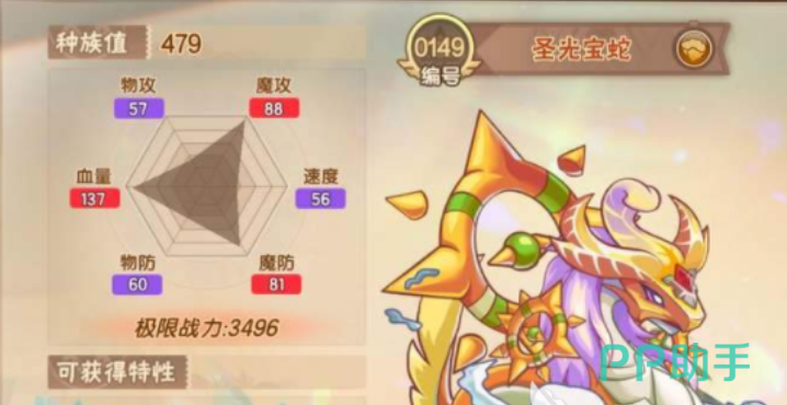 圣光宝蛇也是一个比较好的精灵,它是魔攻界的强者,拥有魔攻种族值比较高,它还具备强化和硬控的效果。不过很多玩家想要获得圣光宝蛇的时候,需要通过永恒梦境的特定关卡,然后到特定的楼层才能够将其捕捉。