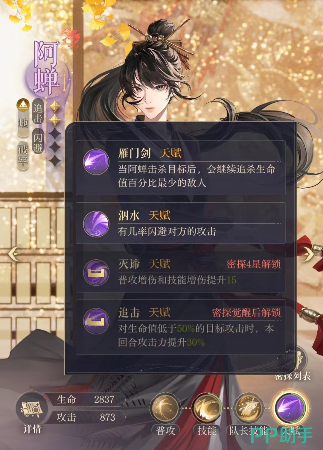 对于如鸢刚开服的殿下们来说,主线剧情的前三章在密探培育初期,在没有获得较多的绝密密探之前,非常需要阿蝉这类机密密探作为编队主要输出,玩家可以利用主线剧情过关奖励的符传,在日常卡池绣衣天下中抽取到多的阿蝉密探,为阿蝉进行升星化极,提升阿蝉的攻击力、生命值以及大招技能等级,并同时解锁阿蝉天赋技能,增强阿蝉密探在编队中的输出战力。