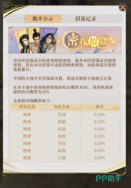 如鸢卡池密探角色分为金、紫、蓝三种品质,哪怕在后续出的限定卡池玩家们获得的密探最高也是金卡。如鸢常驻的卡池是有保底机制,40抽出金卡。小保底10抽出金或紫,大概率保紫,保底累计的抽数在出金的时候就会清零。