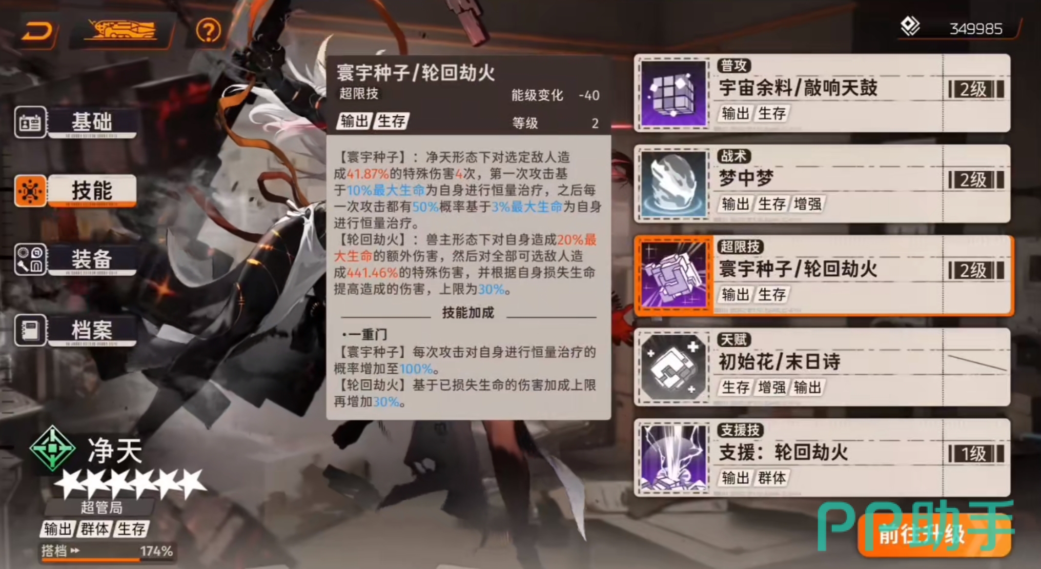 小技能梦中梦可以主动切换形态,人换兽可以提供自身攻击力,兽换人主要的就是提升自身最大生命百分比的治疗效果。所以用攻受兼备这个词来形容净天丝毫没有问题大技能初始花以及末日诗更加有特色,人形态受到攻击的时候会免伤,生命值太低会治疗自身;兽形态增加暴击率和对敌人的最大生命值额外伤害。