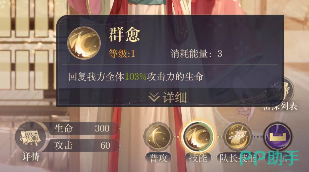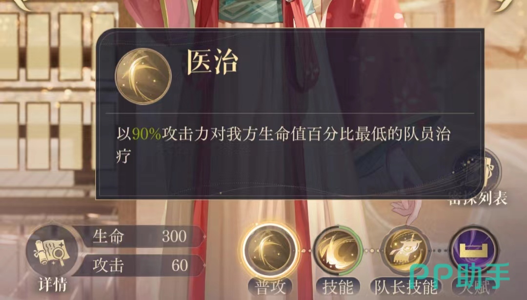 首先作为具有治疗效果的密探,伍丹的普攻技能可以为全队生命比例最低的队员回复生命值,虽然恢复生命只有伍丹自身攻击力的90%,但是对于如鸢刚开服的殿下们而言可以弥补缺少治疗类密探的不足。