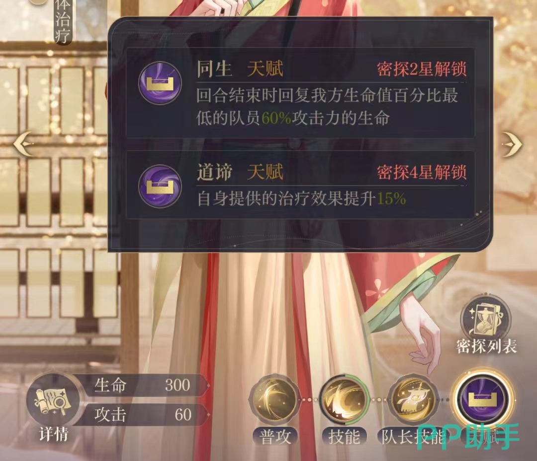 由于伍丹自身时蓝卡密探,所以只拥有两个天赋技能,其中一个是辅助提升回合结束时生命比例最低队员的生命值,另一个是再次提升伍丹自身的生命治疗效果,在最大限度为编队队友提供生命恢复,提升全队抗攻击性。综合从伍丹密探的技能考虑,如果殿下们在如鸢游戏前期缺少治疗型密探,可以用伍丹作为替代,也可以在双治疗辅助阵容中加入伍丹。