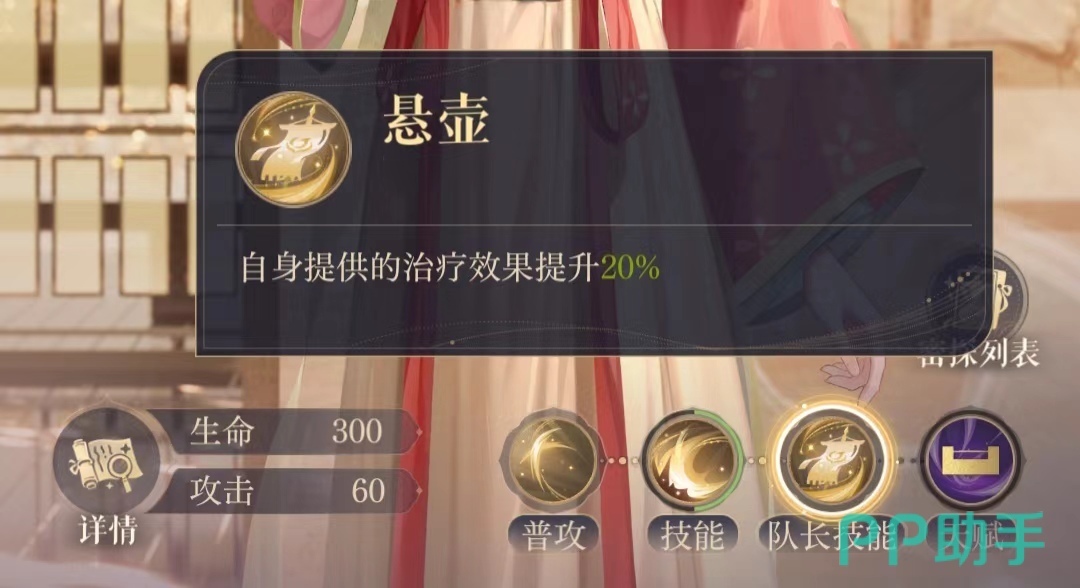 当伍丹作为编队全队队长时,可以对自身治疗效果提升20%,在编队中的密探以攻击输出的密探为主时,殿下们可以考虑将伍丹放置在队长位置,来提升生命治疗效果,帮助全队提升战斗中的抵抗回合数,必要时可以实现绝地反击。