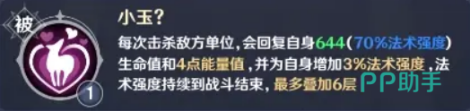 更值得一提的是,小玉的两个被动技能可以进一步将她的主动技能强化。第一个被动效果让她在每次击杀敌方单位时,都能回复一定的生命值和能量,同时还能增加法术强度,且叠加的效果可以持续到战斗结束。最多可叠加六层的法术强度,意味着她越战越强,在战斗后期几乎可以一骑绝尘。