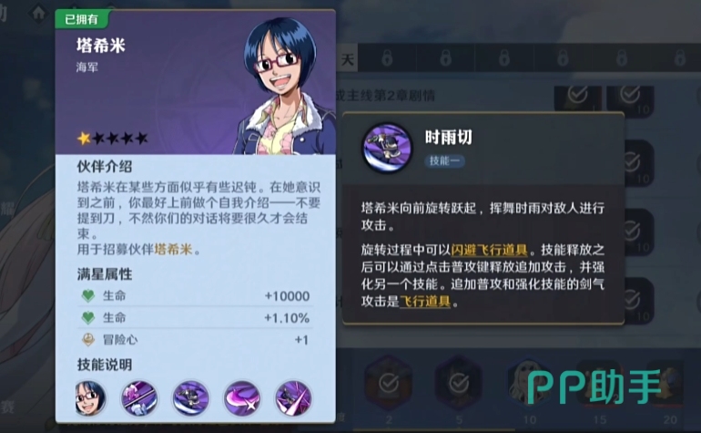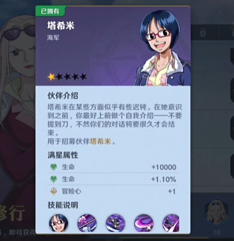 在航海王壮志雄心这款游戏中,达斯琪这个角色在形象中更加的二次元,为了更加配合她海军的身份,在服装上是一身正装,而且还搭配了一副眼镜,在武器上没有变化,还是配备了一把武士刀,不过她在游戏中有了一个新名字【塔希米】。不过她的身份以及背景故事和达斯琪的设定没有变化。