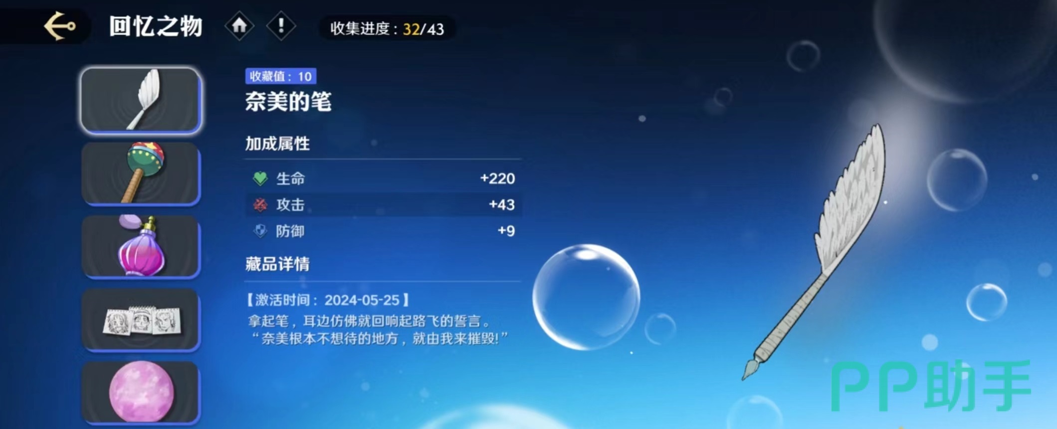 目前小编找到的关于奈美的藏品只有这些,随着游戏的开发,还会有更多的道具出现。游戏里的藏品发现位置并不是固定的,有些是在主线中搜集,有些是在航海探险中发现,还有一些是通过其他活动或者是商店购买来得到,通过各个渠道一起努力,才能够快速收集藏品。这些藏品所增加的属性,是大家战力提升的重要保障,多多收集完全可以帮助玩家快速提升战力通关主线。