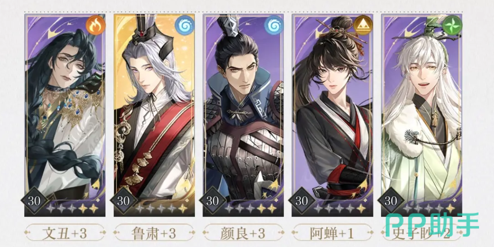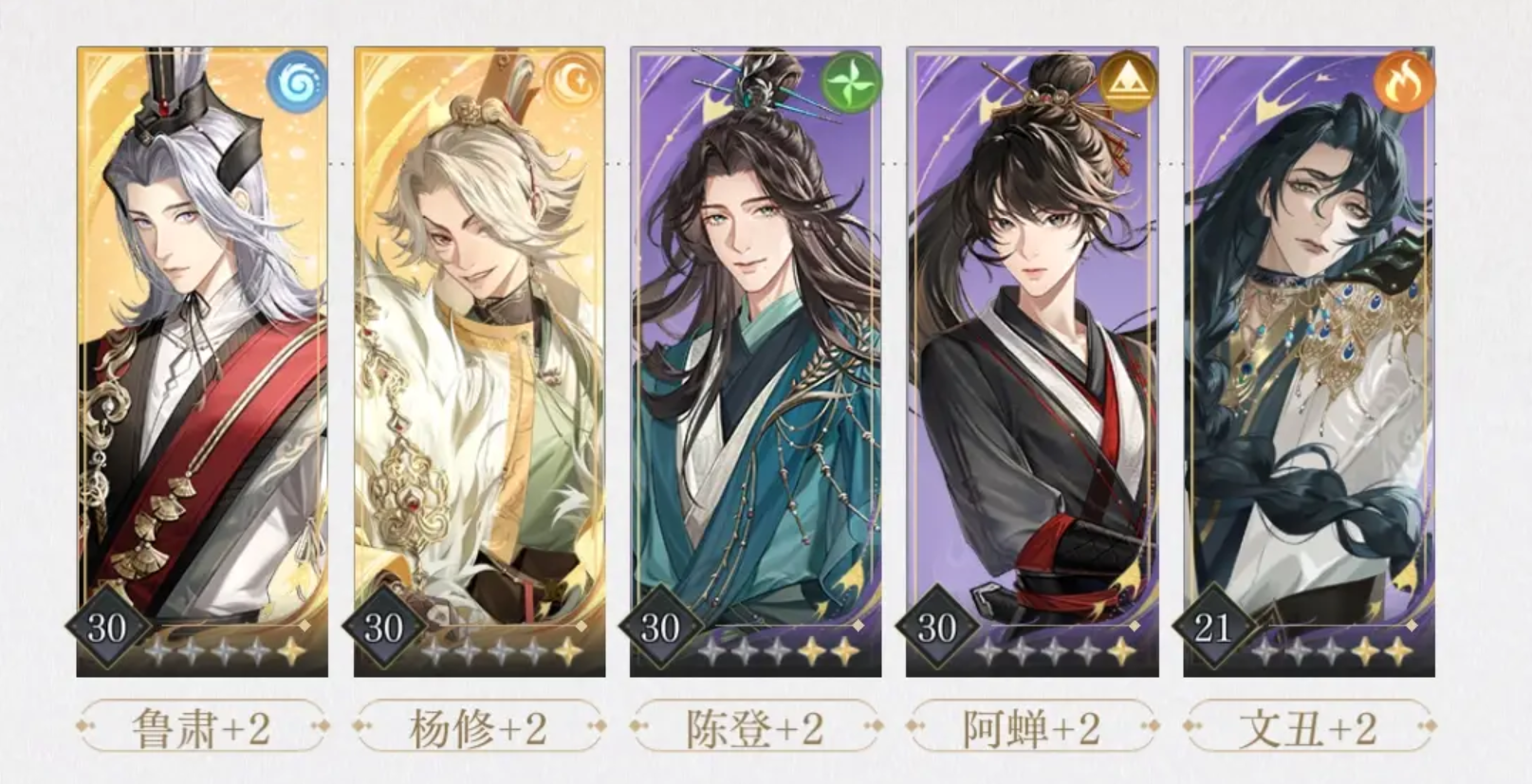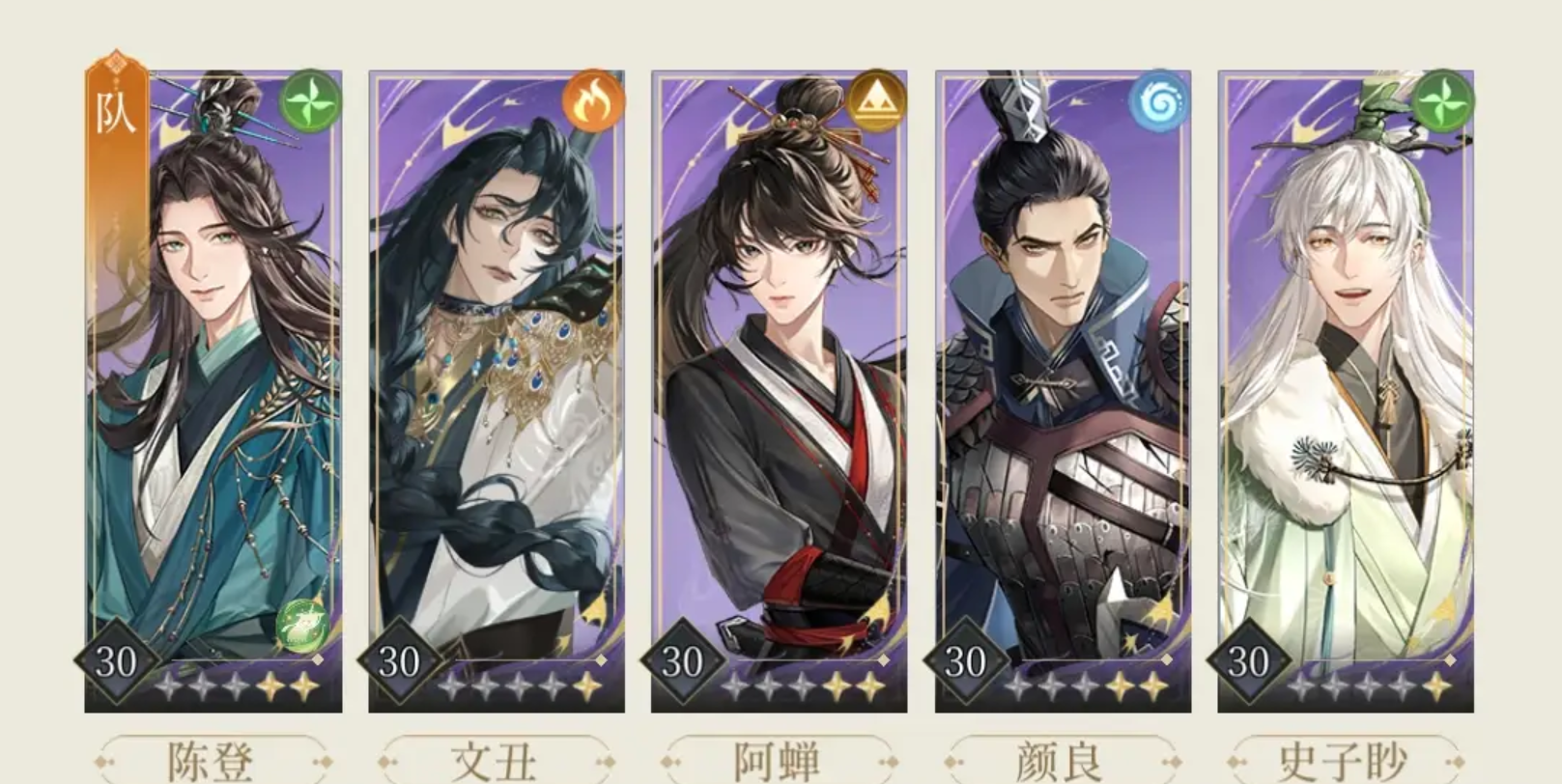第一套阵容可以让陈登担任队长,该搭配里面其实文丑就是担任了主力输出的,群体攻击能力比较强,陈登负责给其他队友快速回复能量,增强文丑的输出频次,让文丑的输出效率提升,毕竟文丑擅长群攻,所以就由阿蝉的追击来补充伤害,狮子喵可以让大家的血量保持健康。