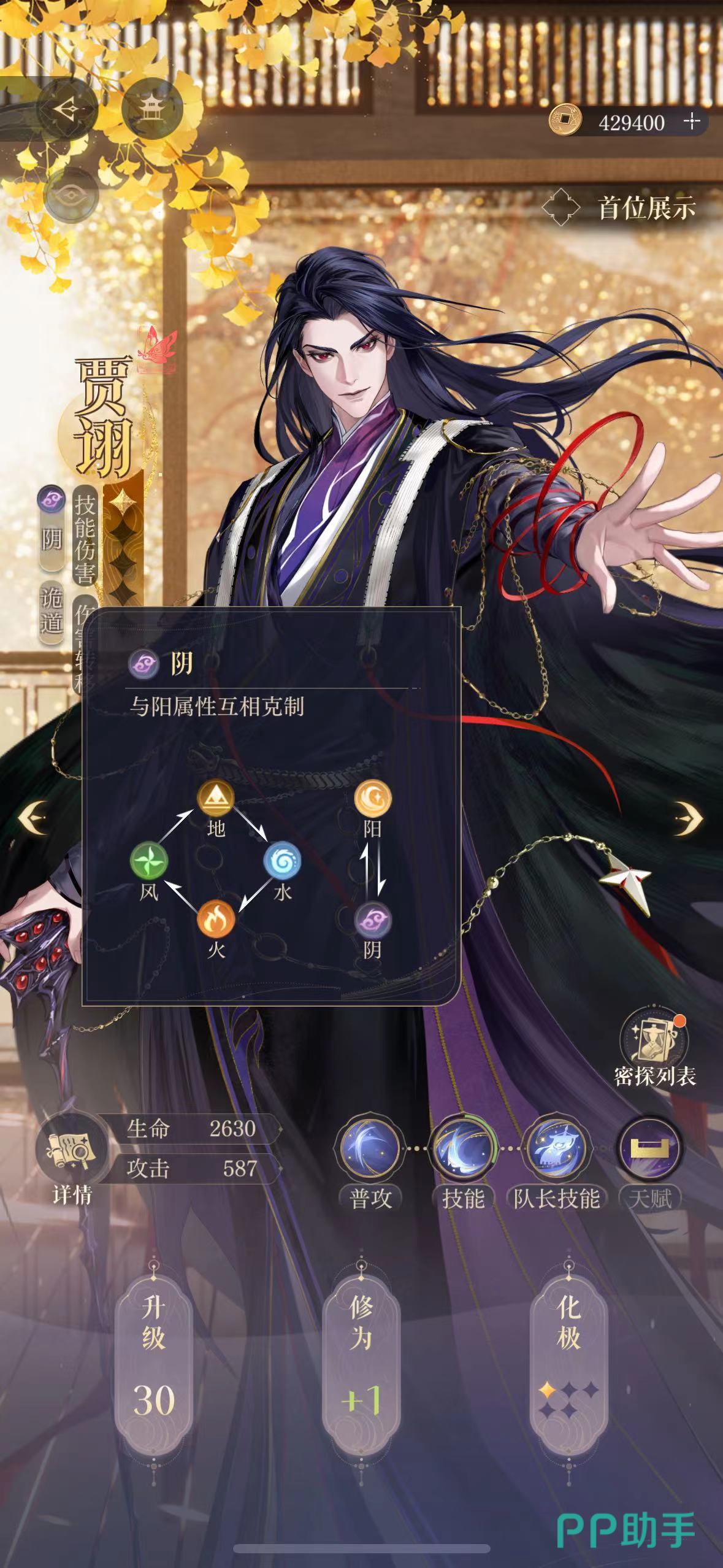 贾诩属于一个阴属性的鬼道角色,面对阳属性密探有着天然的克制能力,他的探索能力包括纵火、卧底、净水、传谣、搜集、营救、下毒、灭火,可以在派遣和鸢报玩法中使用。