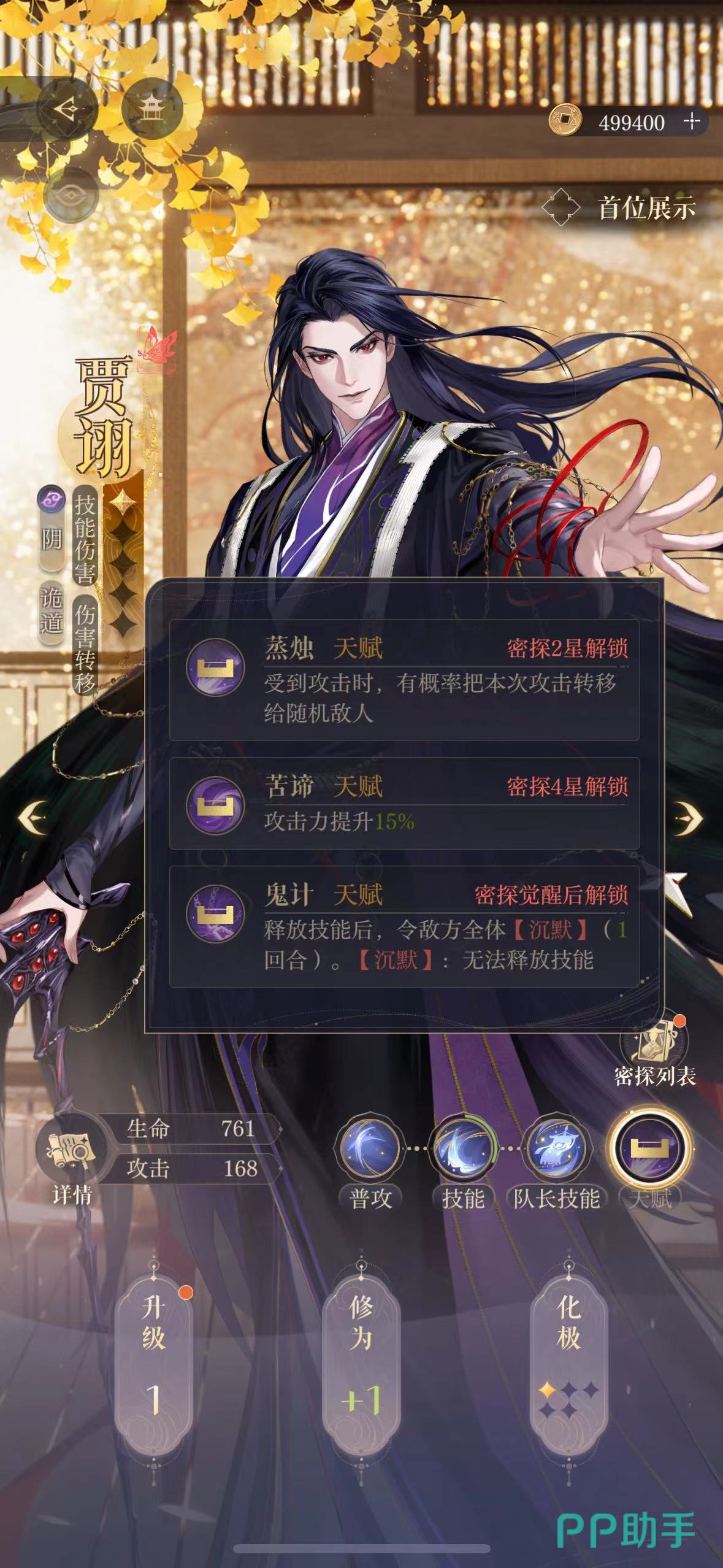 在游戏中,贾诩的品质属于绝密,是目前游戏内品质最高的密探之一,他拥有独特的辅助天赋以及攻击技能,还具备了伤害转移的能力,可以有效的保护队友,在团队中作为辅助坦克使用。
