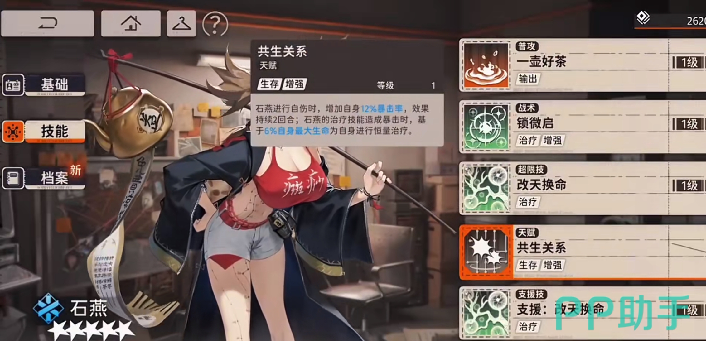 普通攻击一壶好茶对敌方造成物理伤害,每次回复自己8点能量值还是比较少的;战术技能锁微启扣自己的血,为队友回复双倍的血量,并增加自己的防御能力,前期的推关如果阵容不放坦克的话也可以拿她当前排。超限技又是对自己造成伤害并且对队友进行治疗,但是效果改变了,如果此次治疗效果暴击还会额外给生命值最低的队友进行回复,毕竟是有概率的不稳定恢复所以有些鸡肋。