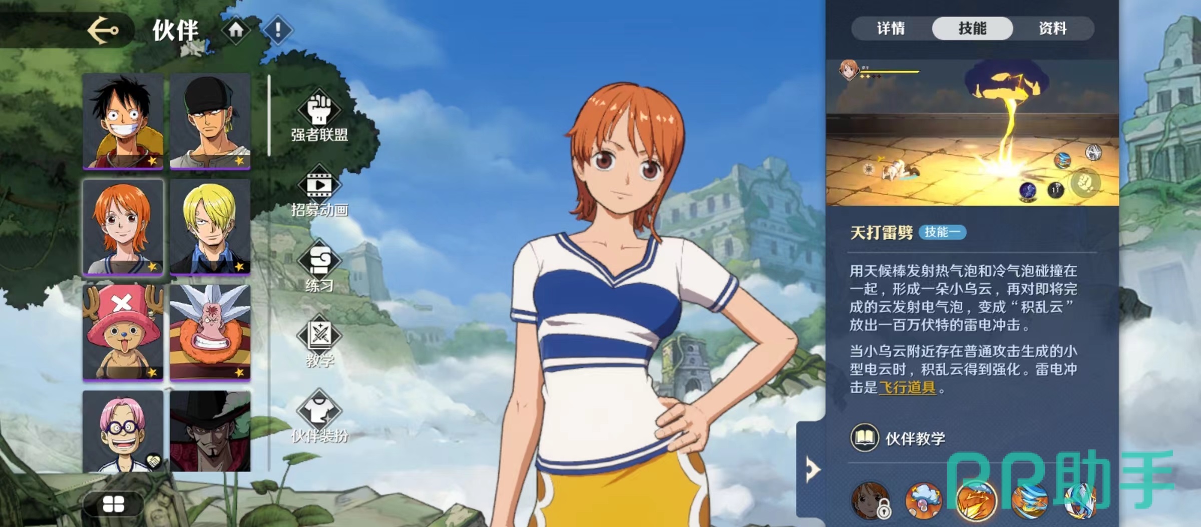 奈美这名角色最大的特点就是使用的武器天候棒,作为草帽一伙中引导航向的航海士,拥有丰富的航海知识,利用天候棒可以使用雷电的力量来攻击敌人,能够引发小规模天气现象,是战斗中非常好的伙伴。它所具有的被动技能,可以利用自己精通的气象学,使用普攻就可以生成小型电云,也可以通过技能释放后点击普攻键的方式来直接生成,电云的效果就是强化另外两个主动技能。