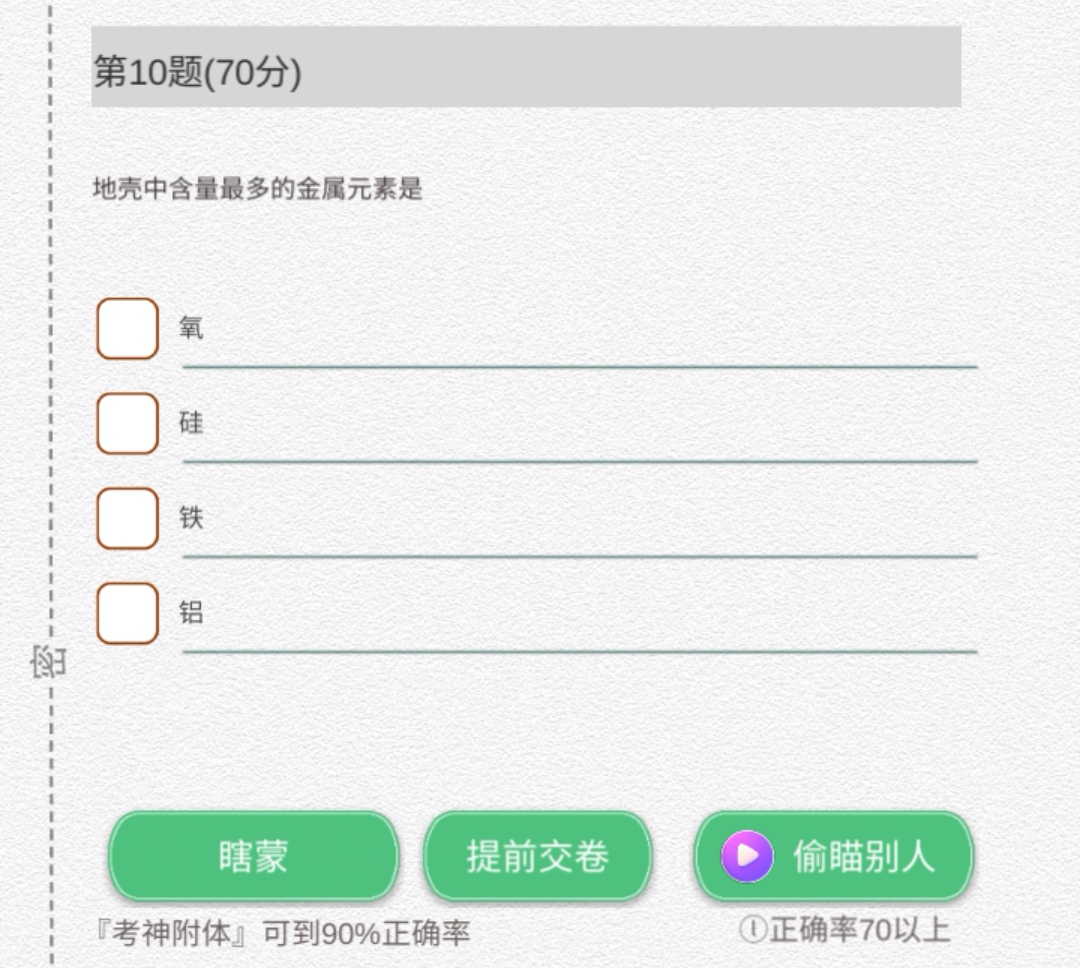 游戏中的题目多是概念定义类题目,中学应该都学过,此外还有一部分生活常识类题目,难度没有多高,就是覆盖面有点广,然后其实大家可以边做边查答案,后台切换app考试不会中断,只要在规定时间内完成交卷就行。