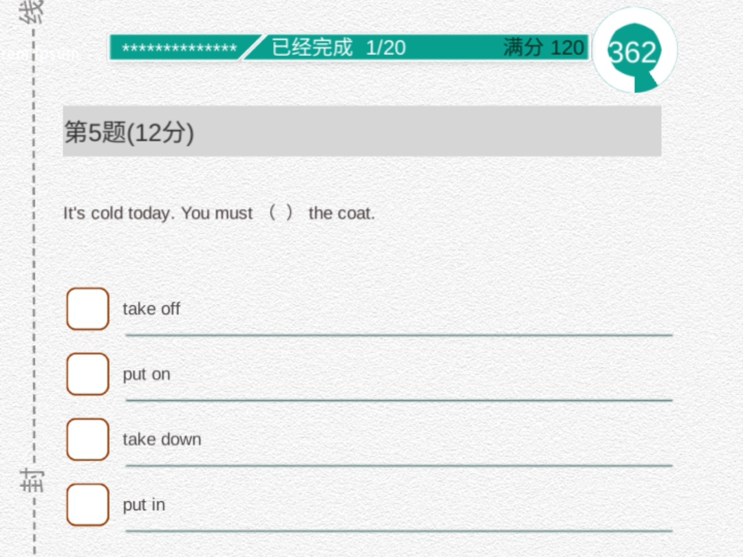 【5】It's cold today. You must ( )the coat.