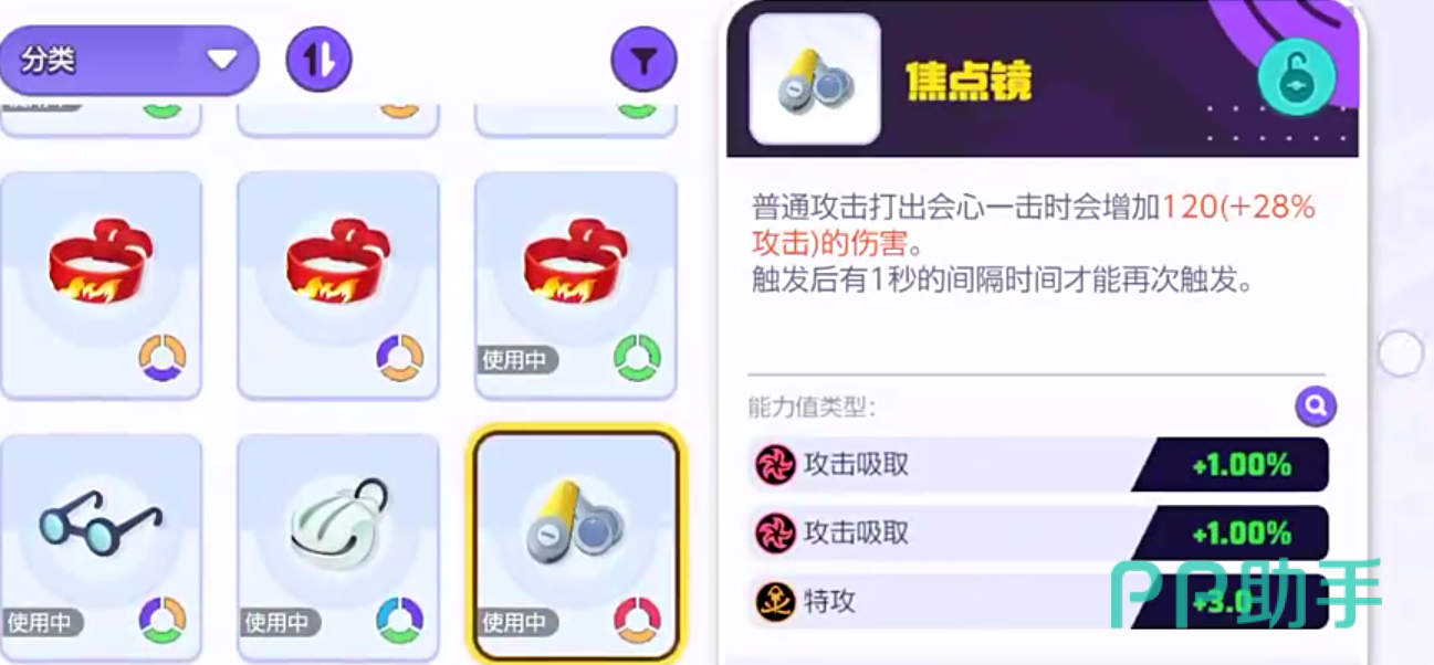 首先要给大家推荐的是焦点镜,焦点镜的能力是让普攻攻击打出会心一击的时候额外增加伤害,要知道这和喷火龙的普攻十分契合,它的普攻能在每一次攻击的时候增加能量,等能量满了后知会容易触发会心一击的,所以喷火龙鞋带焦点镜能让攻击更高。