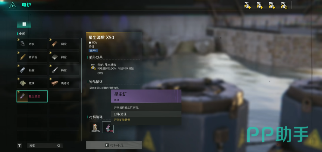 用途之一就是用来打造强力的装备,小伙伴们可以利用星尘矿来合成很多防御或者输出能力非常高的装备,比如护甲,武器等都是可以合成的。更为高级的武器装备可以帮助大家应对更加强大的敌人,显著的提升生存以及输出的能力,是装备合成的重要材料。