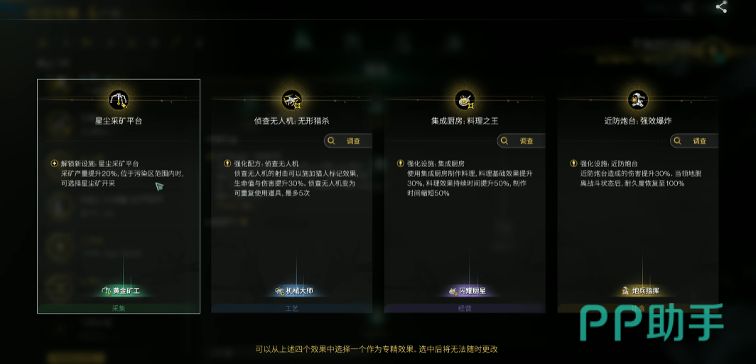 除了装备制造之外,高端科技的解锁,以及建筑强化这两个方面它也发挥着重要额的作用,尤其是到后期,大家会进入科技树更深的层次,那么想要解锁更深一层,星尘矿就非常有必要,不管是新型武器的研发,还是高科技的防御系统,都需要消耗大量的星尘矿来解锁;特殊的建筑也需要使用该材料强化,从而提升建筑的产能或者效果。