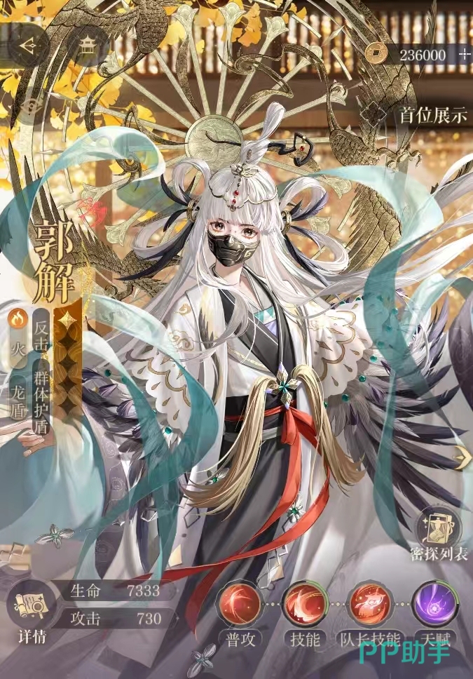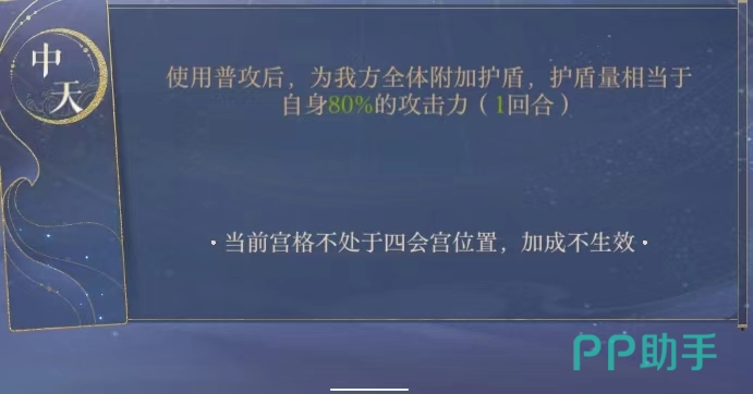 在命盘中,玩家第1个要洗练出来的属性就是【使用普攻后,我方全体附加护盾,护盾量相当于自身80%的攻击力】,从根源上保证了郭姐的护盾量,其次最为重要的是一定要洗练【出回合开始时郭解将不会退场】,不然玩家一旦触发该机制,玩家就是4打n奶量还没有保证。