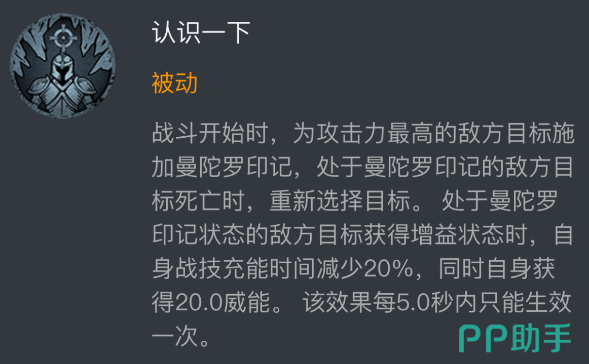 菲莉丝贝塔的被动技能认识一下会在战斗开始时,对攻击力最高的目标敌人施加一层曼陀罗印记,如果有着曼陀罗印记的敌人获得了增益状态的话,菲莉丝贝塔自身的战技技能的充能时间就会减少百分之二十,并且还可以获得二十的威能,不过这个效果是有间隔时间的,每五秒生效一次。不过如果印有曼陀罗印记的敌人死亡的话,还会重新选择目标敌人,印记并不会消失哦。