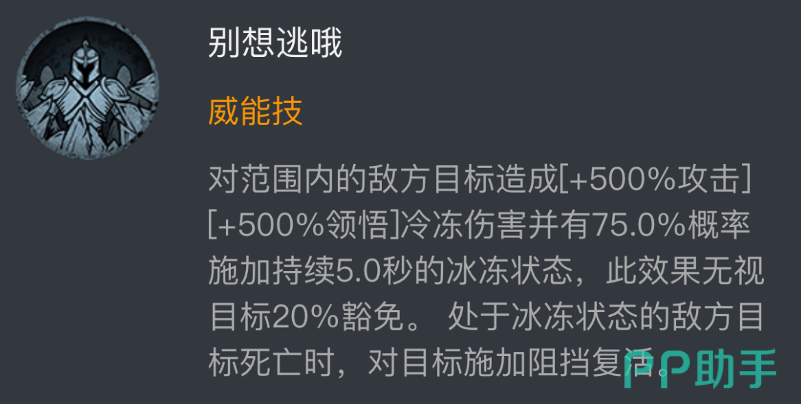 菲莉丝贝塔的威能技别想逃哦可以对技能范围内的敌人造成冷冻的伤害,而且有百分之七十五的概率可以同时对敌人施加冰冻效果持续五秒,并且这个效果是可以是可以无视敌人目标百分之二十的豁免的。如果敌人在冰冻的状态下阵亡的话,还可以阻挡敌人的复活能力。