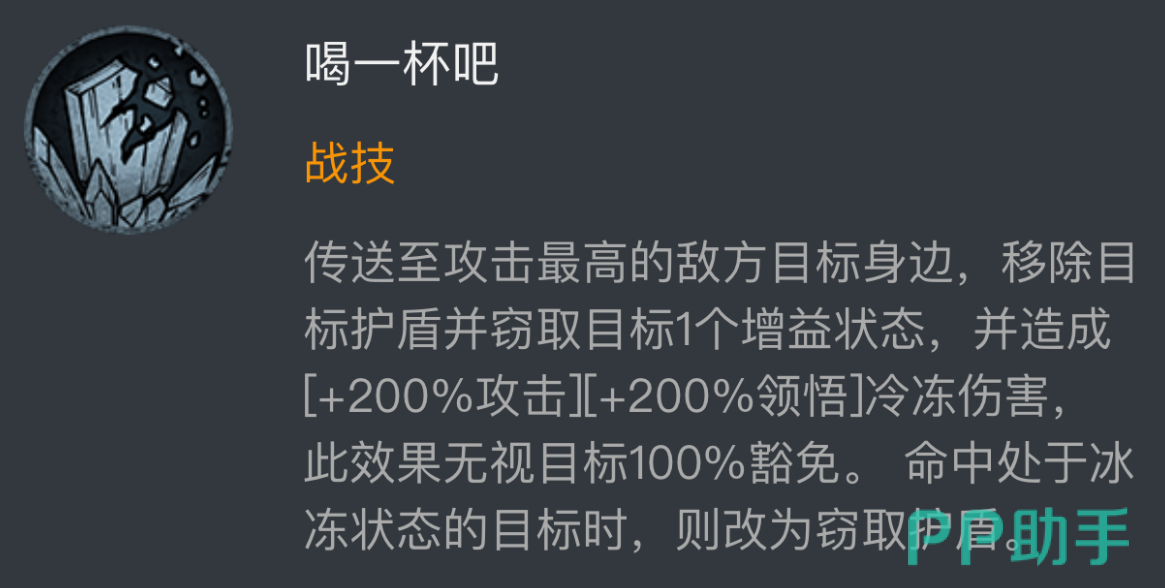 菲莉丝贝塔的战技技能喝一杯吧会将自己传送到攻击力最高的敌人身边,然后将目标敌人的护盾移除,还可以窃取目标敌人的一个增益状态,并同时还可以造成冷冻的伤害,这个效果将会无视敌人百分之百的豁免,如果命中了正处于冰冻状态的敌人的话,这个能力就会变成窃取敌人的护盾。